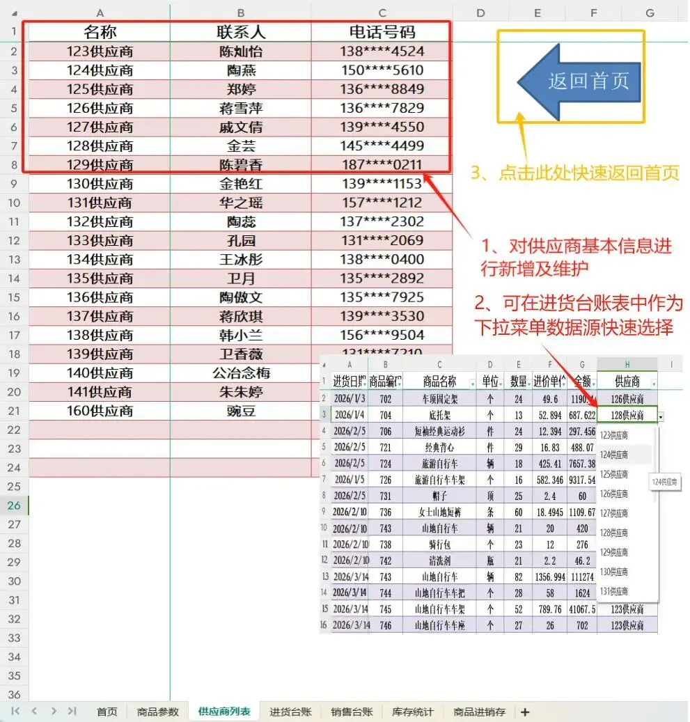 在“供应商列表”工作表中,您可以对供应商的基本信息进行新增及维护。表格包含“名称”“联系人”“电话号码”等字段,清晰记录每个供应商的关键信息,方便后续业务联系和合作。