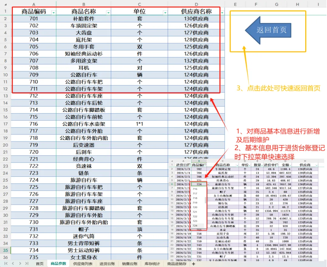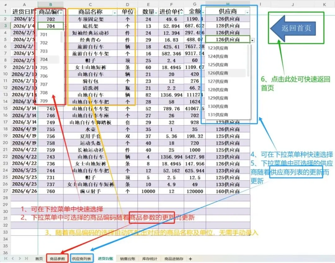“商品参数”工作表用于管理商品的基本信息。在这里,您可以对商品进行新增及后期维护操作。商品参数中的信息会在进货台账登记时作为下拉菜单数据源快速选择,提高数据录入效率。同时,当商品参数更新时,相关下拉菜单中可选择的商品编码也会随之更新。