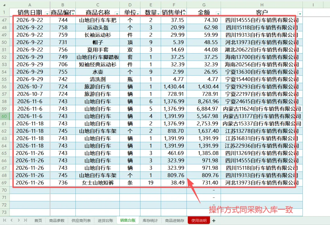 “销售台账”工作表用于记录商品的销售信息。操作方式与进货台账类似,确保数据录入的规范性和准确性,方便后续的销售数据统计和分析。
