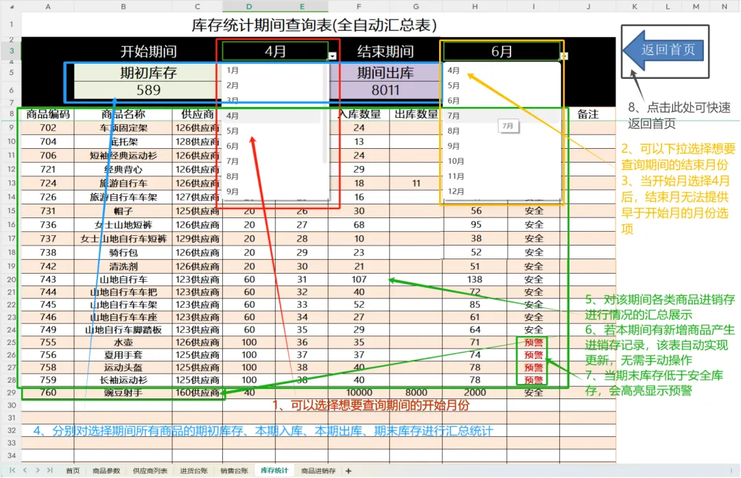“库存统计”工作表是一个全自动汇总表,您可以根据需要选择想要查询期间的开始月份和结束月份(需要注意的是,当开始月选择某月后,结束月无法提供早于开始月的月份选项)。系统会分别对选择期间所有商品的期初库存、本期入库、本期出库、期末库存进行汇总统计,并展示该期间内各类商品的进销存情况。若本期间有新增商品产生进销存记录,该表会自动实现更新,无需手动操作。当期末库存低于安全库存时,系统会高亮显示预警,提醒您及时补货。