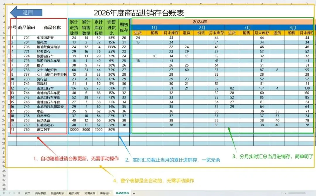 “商品进销存”工作表能够分月实时汇总当月进销存情况,自动随着进货台账和销售台账的更新而更新,无需手动操作,让您对商品的进销存动态一目了然。