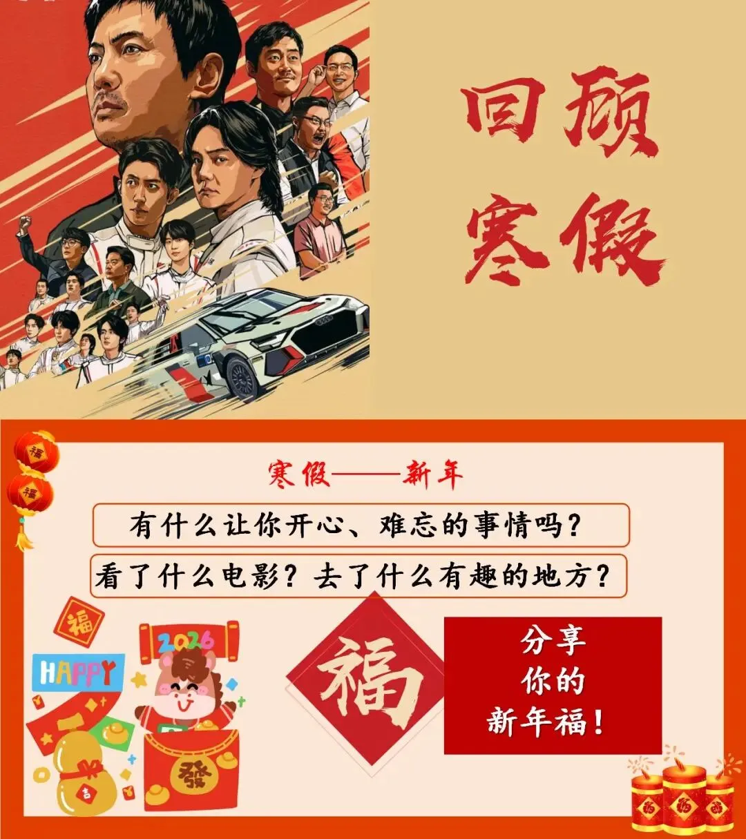 新年的烟火尚未散尽,新学期的号角已经吹响。当我们告别了假期的悠闲与热闹,重新回到熟悉的校园,心中是否充满了期待与些许忐忑?让我们带着这份复杂的心情,一同开启这场名为 “新学期” 的飞驰人生。 回顾刚刚过去的寒假,我们或许与家人共享了团圆的温馨,或许在旅行中见识了更广阔的世界,又或许像《飞驰人生 3》中的主角张驰一样,在自己热爱的事物上投入了无限热情。电影中那句 “我不是想赢,我只是不想输” 的呐喊,道出了不甘平庸的决心;而 “热爱,是永恒的引擎” 则告诉我们,真正的动力源于内心的热爱。这份热爱,不应只停留在假期的娱乐中,更应成为我们新学期学习与生活的驱动力。 新学期,是一段全新的赛道。我们要像赛车手一样,迅速调整状态,从 “假期模式” 切换到 “上学模式”。按时起床,告别懒觉;收好电子设备,制定合理的学习计划;备好学习用品,以饱满的精神迎接每一天的挑战。课堂上,我们要像张驰对待赛车一样专注,认真听讲,积极思考;遇到困难时,要像他面对赛道上的泥泞与坎坷一样,永不言弃,屡败屡战。记住,成功不是看谁跑得最快,而是看谁能坚持到终点。 新的学期,也是树立新目标的时刻。请重温你上学期的目标,反思自己是否已经达成。如果尚未实现,请不要气馁,重新审视自己,制定一份专属的提升计划。正如电影中所说,“只要方向盘还在我手里,我就还有机会。” 这个学期,让我们选择自己想要拼命的方向,找到志同道合的伙伴,互相鼓励,共同进步。 同学们,青春的赛道已经铺就,新学期的引擎已经发动。愿我们都能带着对知识的热爱,对梦想的执着,在学习的赛道上勇敢飞驰,用努力和坚持书写属于自己的精彩人生。让我们以梦为马,不负韶华,在新的学期里,每天进步一点点,做最好的自己!