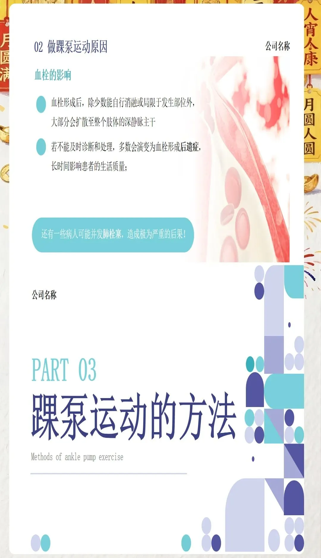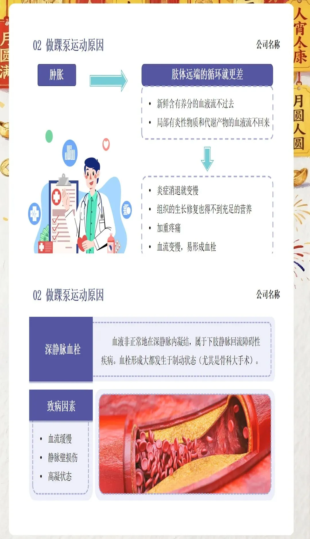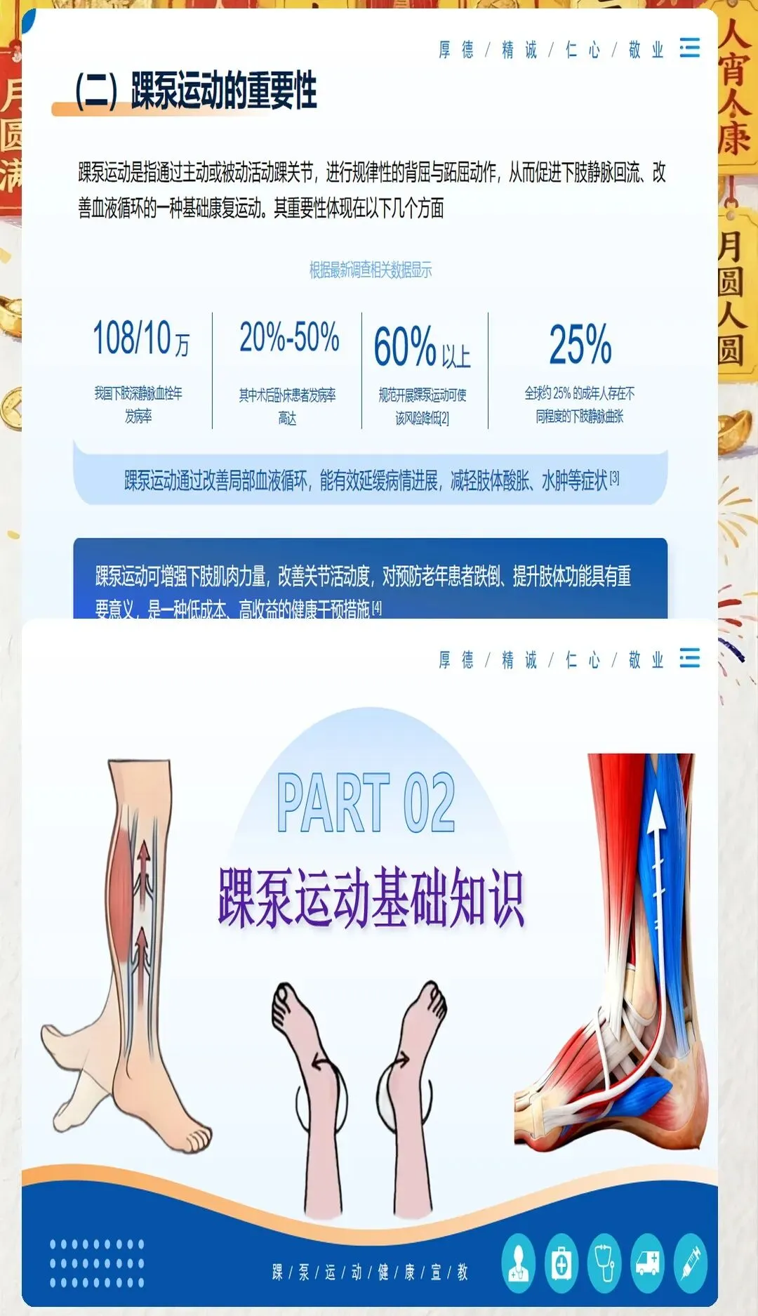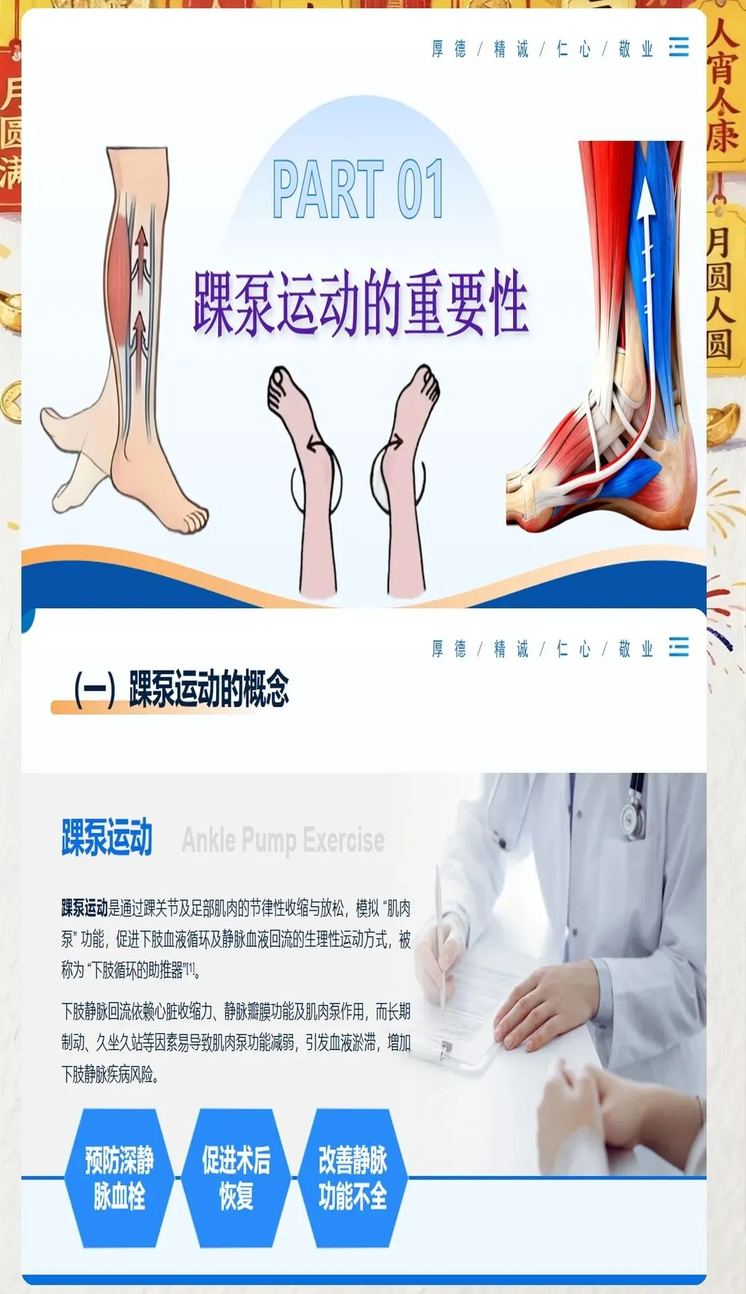 在临床工作中,我们常常会遇到一些患者因为术后长期卧床、肢体活动受限等原因,出现下肢肿胀、疼痛等不适症状,甚至引发深静脉血栓这一严重并发症。深静脉血栓一旦脱落,可能会随血液流动堵塞肺动脉,导致肺栓塞,严重威胁患者的生命安全。因此,预防深静脉血栓的发生,是医护工作中至关重要的一环。而踝泵运动,作为一种简单易行、效果显著的预防方法,值得我们每一位医护人员向患者进行推广和宣教。