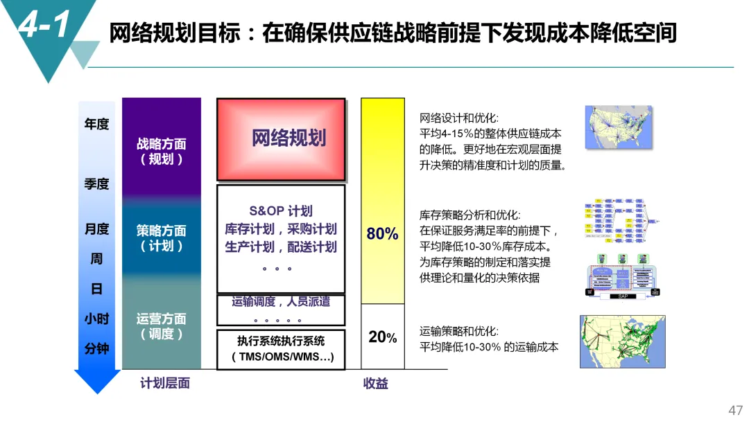 供应链的物理载体是设施网络。仓库该设几级?工厂生产哪些品类?每个节点服务哪些区域?这些问题的答案直接影响履约成本与时效。通过数据建模进行网络规划,可以在保证服务水平的前提下,发现10%~30%的库存优化空间。建模时需纳入供应商分布、客户需求、运输模式、库存成本等变量,用场景模拟替代经验判断。