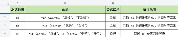 - IF(条件判断):按条件返回结果,适用于业绩达标判断、状态分类;