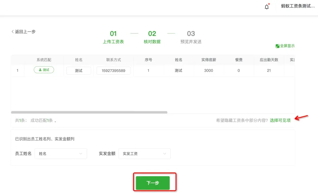 【如需隐藏工资条中部分字段,可点击“选择可见项”进行设置。】