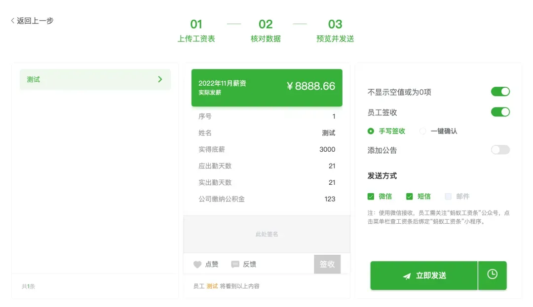 预览工资条效果,可依据实际需要开启手写签收、一键确认、自动确认、添加公告等功能,确认后点击【立即发送】或【 预约发送】;