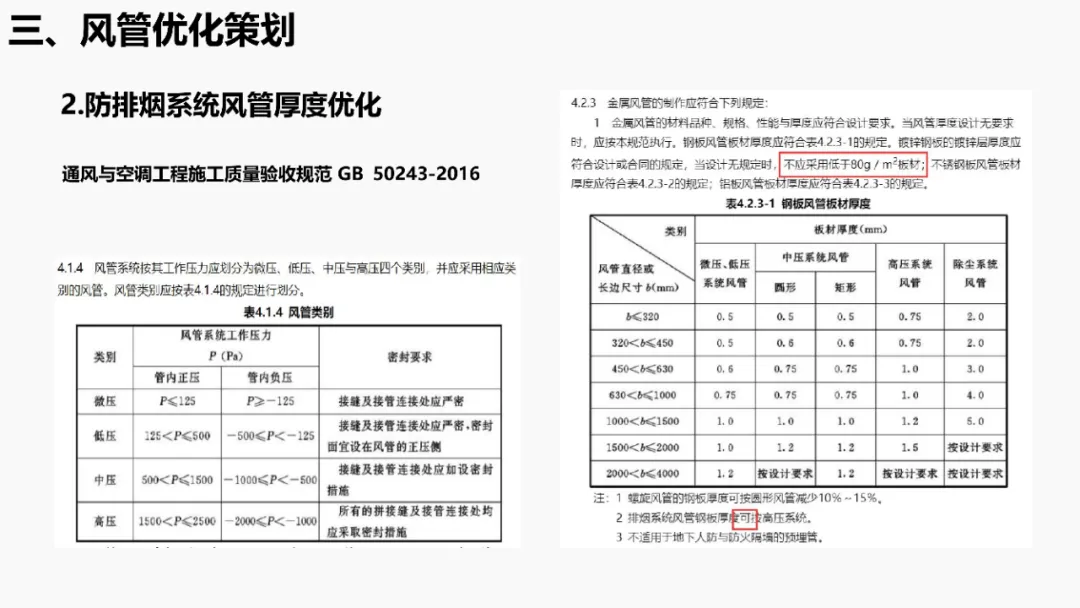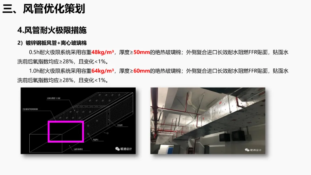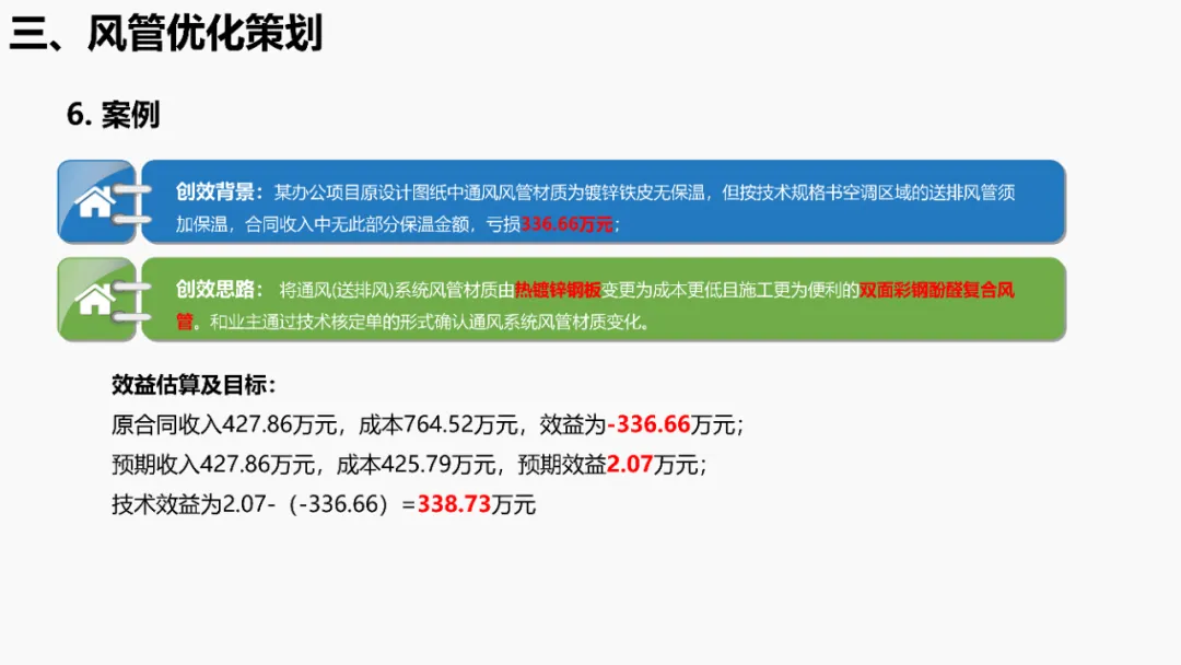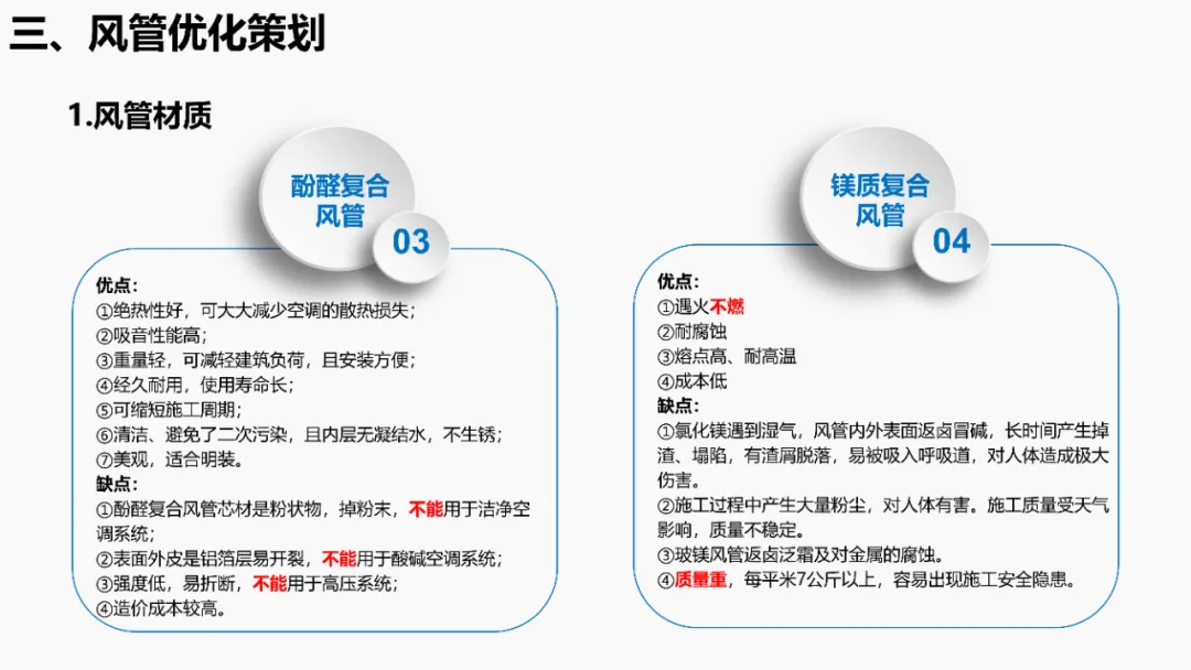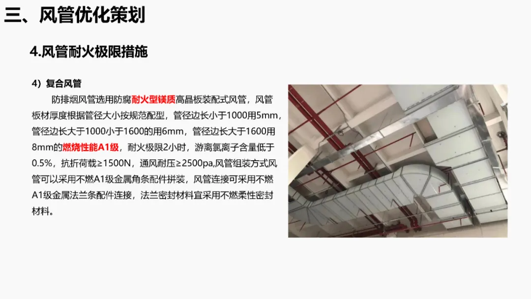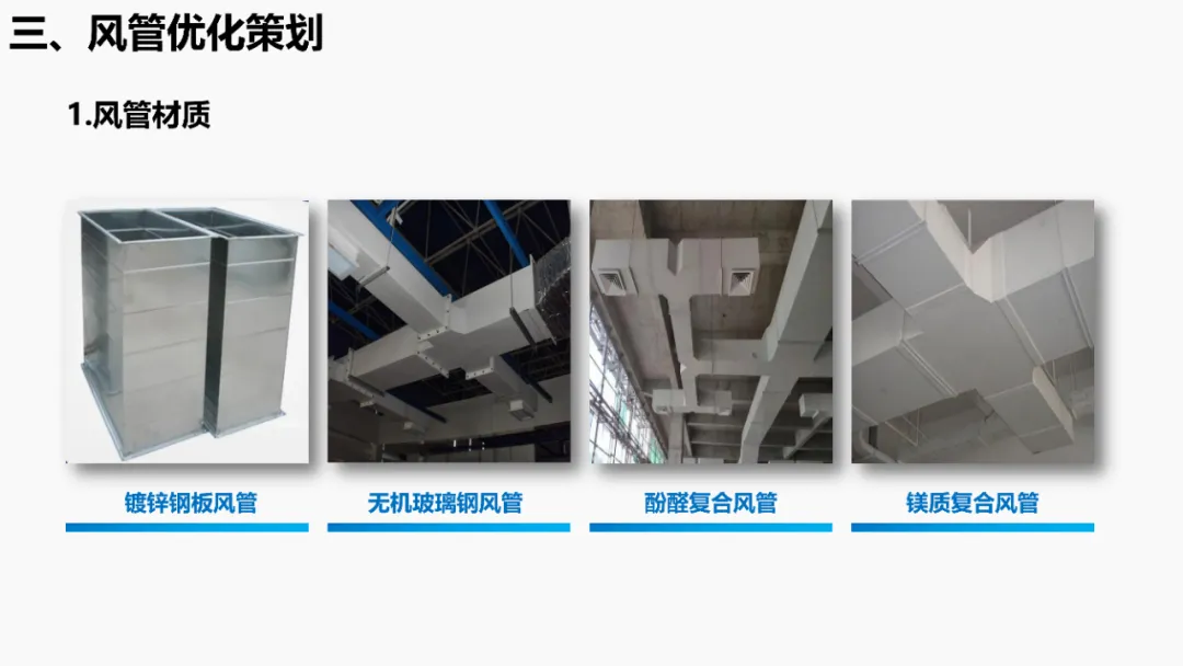 依据《建筑抗震设计规范》等强条,明确抗震支架设置范围(如重力>1.8kN的管道、DN65以上消防管等)。通过案例说明优化方法:复核设计饱和量、调整排布间距、选择高性价比供货商,实现成本节约。分析镀锌钢板、无机玻璃钢等风管材质优缺点,对比防排烟风管厚度规范(按中压系统设计)。提出耐火极限措施(如岩棉+防火板包覆),并通过材质替换(如镀锌板→酚醛复合风管)降低造价。针对消防产品3CF认证政策调整(取消部分强制认证),优化策略包括:取消大风阀拆分拼装、简化阀门组合(如MEC+FDH→MECH),强调需与业主协调政策差异。通过计算风管最不利环路阻力(ΔP=沿程损失+局部损失),优化风管尺寸/形状(圆形阻力最小),调整风机参数并重新认价,避免风量不足风险。加湿优化策划对比湿膜、干蒸汽等加湿方式优缺点(如湿膜易霉变、干蒸汽需汽源)。提出选型原则(有汽源优先干蒸汽)及加湿量计算公式(W=1.2×G×(d2-d1)),优化湿膜材料与厚度。平衡阀优化策划比选三种阀门组合方案:方案一(静态阀+电动阀)成本低但动态平衡差;方案二(动态阀+比例阀)性能优;方案三(一体阀)简化调试且性价比高。优化点包括避免阀门重叠、按KV值选型。文档聚焦暖通系统全链条创效,从抗震支架排布、风管材质/耐火优化、3CF认证简化,到水力计算调参、加湿技术选型及平衡阀组合,系统性提出降本增效策略,确保技术合规与经济性平衡。完整版资料下载方式:加小编QQ:3989690508,领取!
