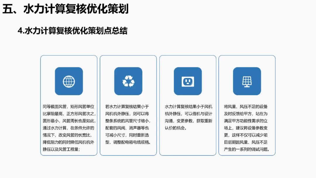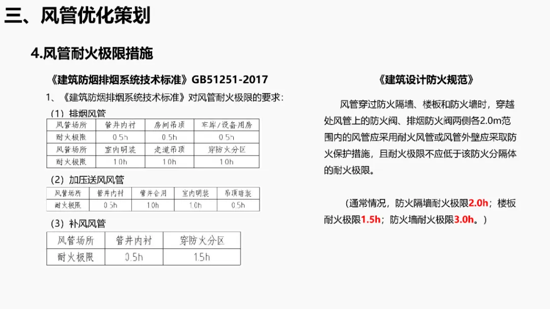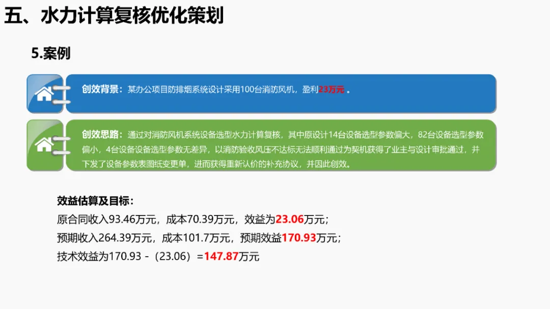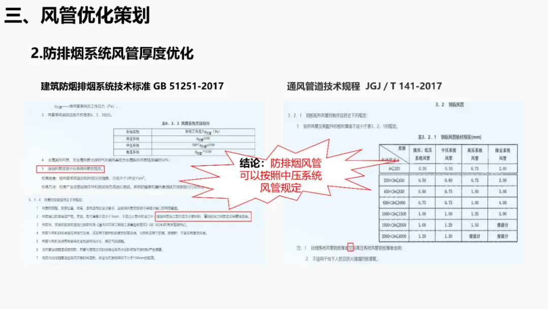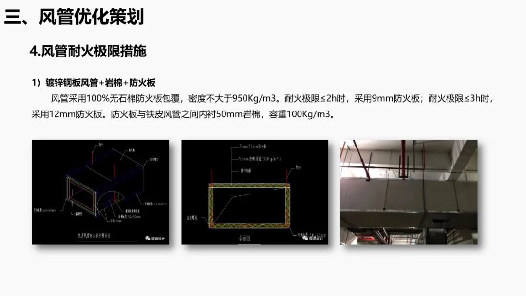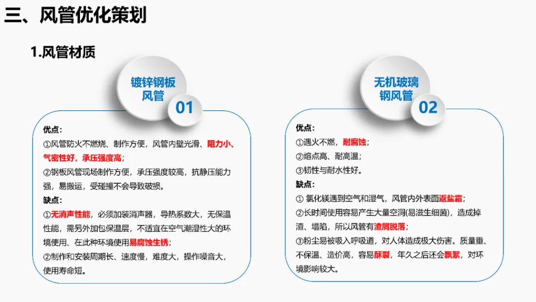 依据《建筑抗震设计规范》等强条,明确抗震支架设置范围(如重力>1.8kN的管道、DN65以上消防管等)。通过案例说明优化方法:复核设计饱和量、调整排布间距、选择高性价比供货商,实现成本节约。分析镀锌钢板、无机玻璃钢等风管材质优缺点,对比防排烟风管厚度规范(按中压系统设计)。提出耐火极限措施(如岩棉+防火板包覆),并通过材质替换(如镀锌板→酚醛复合风管)降低造价。针对消防产品3CF认证政策调整(取消部分强制认证),优化策略包括:取消大风阀拆分拼装、简化阀门组合(如MEC+FDH→MECH),强调需与业主协调政策差异。通过计算风管最不利环路阻力(ΔP=沿程损失+局部损失),优化风管尺寸/形状(圆形阻力最小),调整风机参数并重新认价,避免风量不足风险。加湿优化策划对比湿膜、干蒸汽等加湿方式优缺点(如湿膜易霉变、干蒸汽需汽源)。提出选型原则(有汽源优先干蒸汽)及加湿量计算公式(W=1.2×G×(d2-d1)),优化湿膜材料与厚度。平衡阀优化策划比选三种阀门组合方案:方案一(静态阀+电动阀)成本低但动态平衡差;方案二(动态阀+比例阀)性能优;方案三(一体阀)简化调试且性价比高。优化点包括避免阀门重叠、按KV值选型。文档聚焦暖通系统全链条创效,从抗震支架排布、风管材质/耐火优化、3CF认证简化,到水力计算调参、加湿技术选型及平衡阀组合,系统性提出降本增效策略,确保技术合规与经济性平衡。完整版资料下载方式:加小编QQ:3989690508,领取!