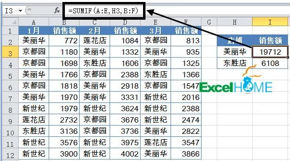SUMIF函数的条件区域使用A:E的整列引用,求和区域使用B:F的整列引用,如果A:E等于指定的店铺,就对B:F对应的内容进行求和。