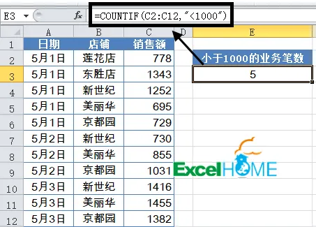 如下图所示,要统计销售额小于1000的业务笔数。