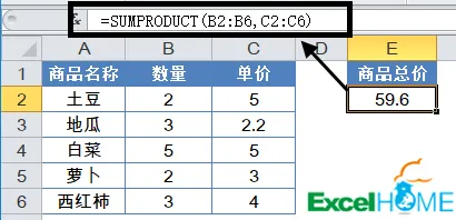 SUMPRODUCT返回数组之间乘积的总和,也就是先把B列的数量和C列的单价对应相乘,然后计算这些乘积的总和。