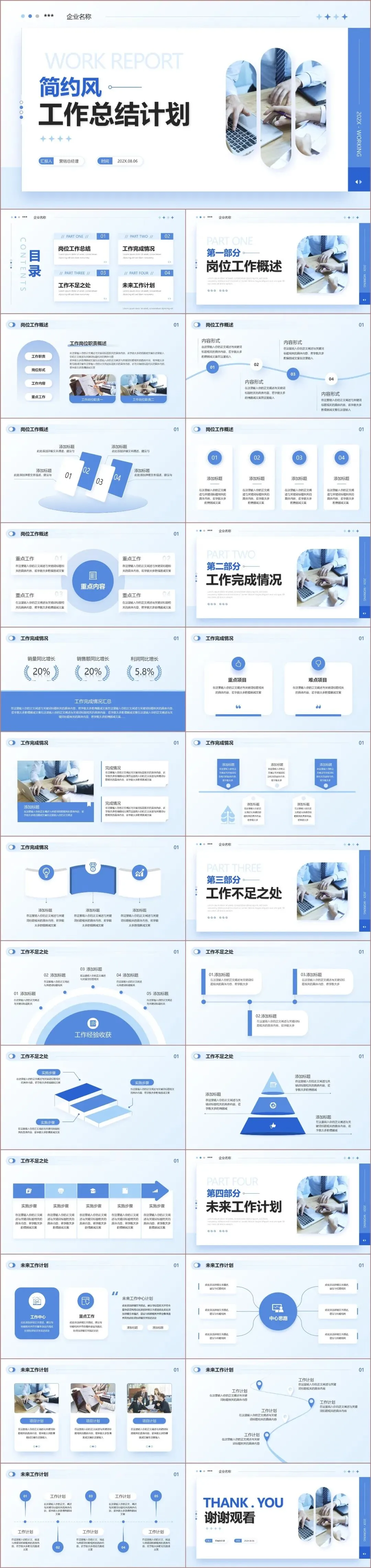 页数与结构:模板共包含约15至20页,结构完整且逻辑严密。严格遵循“岗位概述 → 完成情况 → 不足反思 → 未来规划”的标准汇报框架。主要页面包括: