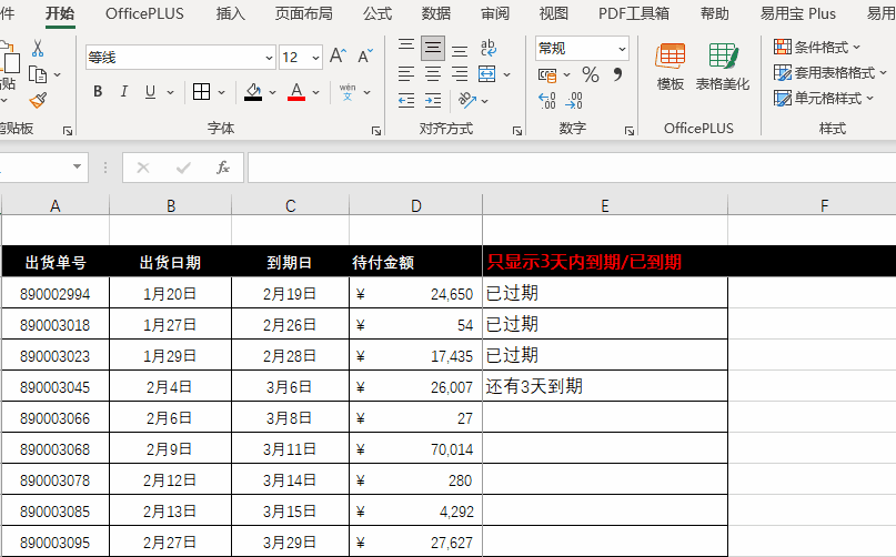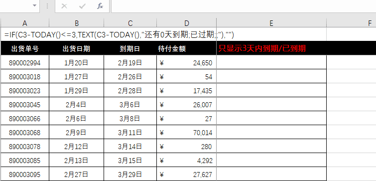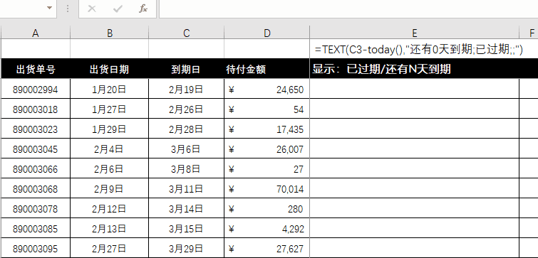 公式:=text(C3-today(),"还有0天到期;已过期")