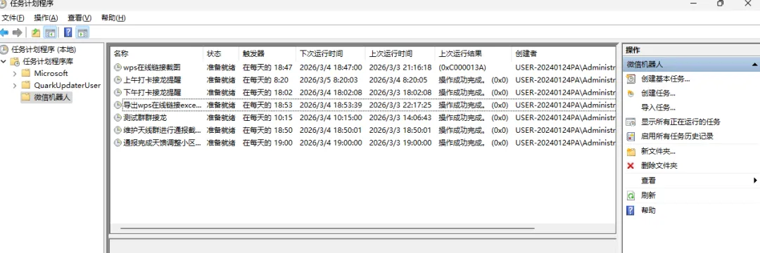 # 读取天馈调整表Excel表内容发送到微信群里.pyimport timeimport pyperclipimport win32apiimport win32conimport osimport datetimeimport pandas as pdfrom ctypes import windll# ======== Excel节假日判断功能 ==========class ExcelHolidayChecker: def __init__(self, excel_file="2026年法定节假日表.xlsx"): self.excel_file = excel_file self.holidays = {} self.working_weekends = [] self.load_holidays_from_excel() def load_holidays_from_excel(self): """从Excel文件加载节假日数据""" try: if not os.path.exists(self.excel_file): print(f"⚠️ 节假日文件不存在: {self.excel_file}") print("将使用默认的2026年节假日配置") self.load_default_holidays() return # 读取法定节假日 holidays_df = pd.read_excel(self.excel_file, sheet_name='法定节假日') for _, row in holidays_df.iterrows(): date_str = str(row['日期'])[:10] # 取日期部分 self.holidays[date_str] = row['节假日名称'] # 读取调休工作日 working_weekends_df = pd.read_excel(self.excel_file, sheet_name='调休工作日') for _, row in working_weekends_df.iterrows(): date_str = str(row['日期'])[:10] self.working_weekends.append(date_str) print(f"✅ 成功加载节假日数据: {len(self.holidays)} 个节假日, {len(self.working_weekends)} 个调休工作日") except Exception as e: print(f"❌ 读取节假日文件失败: {e}") print("将使用默认的2026年节假日配置") self.load_default_holidays() def load_default_holidays(self): """加载默认的2026年节假日配置""" self.holidays = { "2026-01-01": "元旦", "2026-02-17": "春节", "2026-02-18": "春节", "2026-02-19": "春节", "2026-02-20": "春节", "2026-02-21": "春节", "2026-02-22": "春节", "2026-02-23": "春节", "2026-04-05": "清明节", "2026-05-01": "劳动节", "2026-05-02": "劳动节", "2026-05-03": "劳动节", "2026-06-19": "端午节", "2026-06-20": "端午节", "2026-06-21": "端午节", "2026-09-25": "中秋节", "2026-09-26": "中秋节", "2026-09-27": "中秋节", "2026-10-01": "国庆节", "2026-10-02": "国庆节", "2026-10-03": "国庆节", "2026-10-04": "国庆节", "2026-10-05": "国庆节", "2026-10-06": "国庆节", "2026-10-07": "国庆节", } self.working_weekends = ["2026-02-15", "2026-02-28", "2026-10-10"] def is_holiday(self, date_obj=None): """判断指定日期是否为法定节假日""" if date_obj is None: date_obj = datetime.datetime.now() date_str = date_obj.strftime('%Y-%m-%d') # 如果是调休工作日,不算节假日 if date_str in self.working_weekends: return False # 如果是法定节假日 if date_str in self.holidays: return True # 如果是周末且不是调休工作日 if date_obj.weekday() >= 5: return True return False def is_working_day(self, date_obj=None): """判断指定日期是否为工作日""" return not self.is_holiday(date_obj) def get_holiday_info(self, date_obj=None): """获取节假日信息""" if date_obj is None: date_obj = datetime.datetime.now() date_str = date_obj.strftime('%Y-%m-%d') if date_str in self.holidays: return f"法定节假日: {self.holidays[date_str]}" elif date_str in self.working_weekends: return "调休工作日" else: if date_obj.weekday() >= 5: return "周末" else: return "工作日"# ===== 检查是否应该执行 =====def check_if_should_run(): """检查今天是否应该执行程序""" # 初始化节假日检查器 checker = ExcelHolidayChecker("2026年法定节假日表.xlsx") today = datetime.datetime.now() holiday_info = checker.get_holiday_info(today) print(f"今天是: {today.strftime('%Y-%m-%d %A')}") print(f"日期类型: {holiday_info}") # 如果是节假日,则不执行主程序 if checker.is_holiday(): print("⚠️ 今天是法定节假日,不发送工作通知,程序退出") return False, holiday_info # 只有工作日才执行主程序 print("✅ 今天是工作日,开始执行工作任务...") return True, holiday_info# ====== 天馈调整Excel处理功能 ======def process_tiankui_excel(): """处理天馈调整表,返回处理结果""" # 1. 定义文件路径 file_path = r"E:\Wechat_XiaoMei_Notice\wps截图通报\天馈调整表.xlsx" # 检查文件是否存在 if not os.path.exists(file_path): print(f"❌ 错误:未找到文件 '{file_path}'") return None, 0, "" # 2. 获取动态日期 today = datetime.datetime.now() target_date = today.strftime('%Y/%m/%d') print(f"📅 正在分析天馈调整表,日期: {target_date}") # target_date = "2026/02/12" try: # 3. 读取Excel文件 try: df = pd.read_excel(file_path, sheet_name=1, dtype=str) except: xls = pd.ExcelFile(file_path) sheet_name = None for name in xls.sheet_names: if '天馈' in name: sheet_name = name break if not sheet_name: sheet_name = xls.sheet_names[0] df = pd.read_excel(file_path, sheet_name=sheet_name, dtype=str) # 4. 智能查找列名 col_map = {} for col in df.columns: if '小区名称' in str(col): col_map['cell_name'] = col if '是否完成调整(只填是和否)' in str(col): col_map['completed'] = col if '调整日期' in str(col): col_map['date'] = col # 检查是否找到必要列 if not all(k in col_map for k in ['cell_name', 'completed', 'date']): print("❌ 错误:未能识别到必要的列") return None, 0, "" # 5. 数据筛选 print(f"🔍 正在筛选日期为 '{target_date}' 且状态为 '是' 的数据...") try: # 将日期列转换为 datetime 类型 df[col_map['date']] = pd.to_datetime(df[col_map['date']], errors='coerce') target_dt = pd.to_datetime(target_date) # 筛选条件 mask = (df[col_map['date']].dt.date == target_dt.date()) & \ (df[col_map['completed']].str.strip() == '是') filtered_df = df[mask] except Exception as e: print(f"⚠️ 日期转换失败: {e}") return None, 0, "" # 6. 生成结果 if len(filtered_df) > 0: cell_names = [] for index, row in filtered_df.iterrows(): cell_names.append(row[col_map['cell_name']]) # 生成报告内容 report_date = target_date.replace('/', '年', 1).replace('/', '月', 1) + '日' report = f"龙汕区-投诉天馈完成进度通报_{report_date}\n" report += f"{report