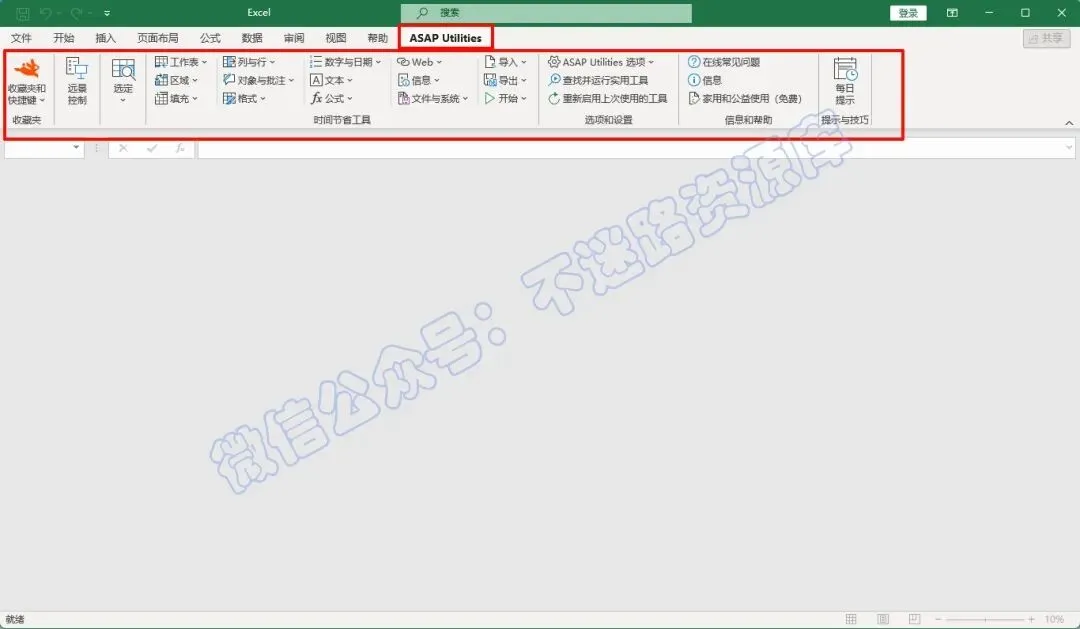 温馨提示:若打开Excel表格没有ASAP Utilities工具箱,请到开始菜单点击ASAP Utilities