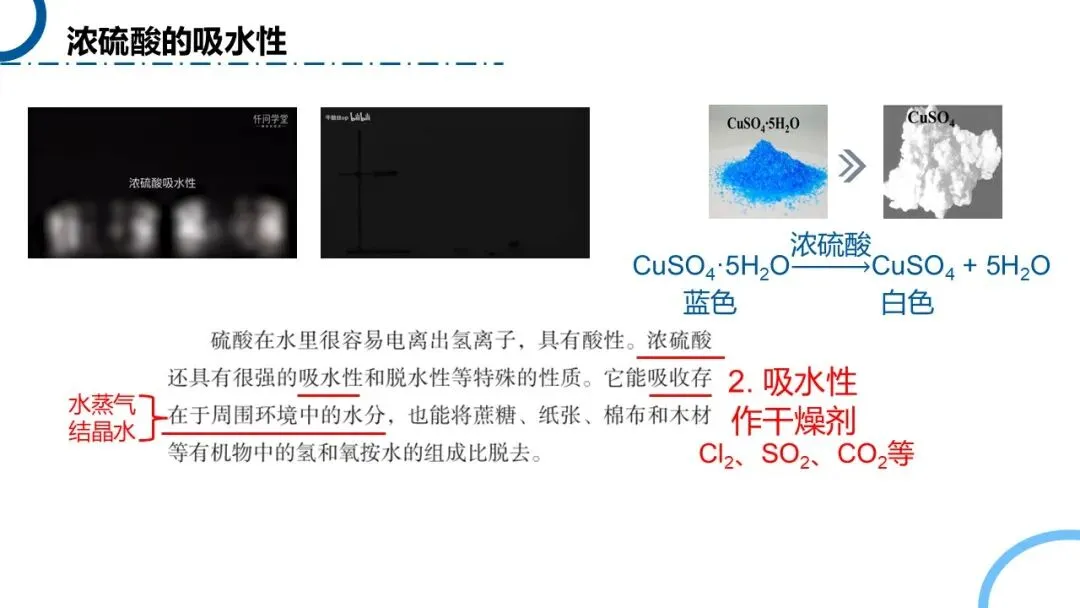 浓硫酸的吸水性,在初中也有接触,这里补充胆矾和浓硫酸的反应,理解吸收水分的不同类型。