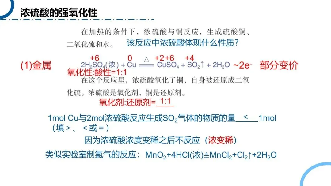从反应方程式中变价情况分析浓硫酸的性质,在反应中体现氧化性和酸性。同时,留意浓变稀的问题。