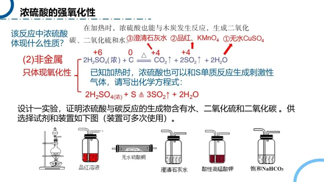 浓硫酸与非金属的反应,相对比较简单。同时,学习检验混合物中水的实验设计,对应一开始的那道题。