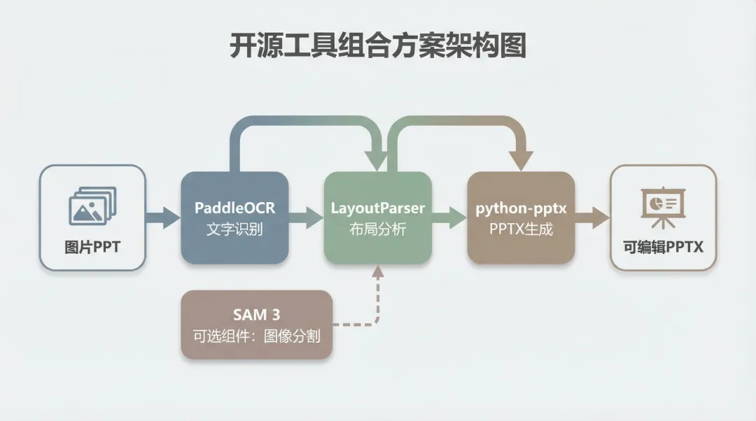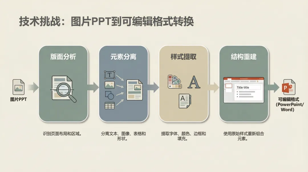 说白了,把图片PPT变成可编辑版本,本质上是个「逆向工程」的过程。原本的PPT是从结构化数据(文本框、形状、图片)渲染成图像的,现在你要反过来,从图像中还原出结构化数据。
