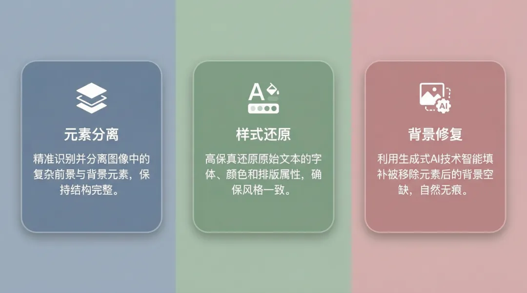 这里有个技术难点:背景修复。当你把文字从图片上移除后,原来文字覆盖的地方会留下空白。要让背景看起来「干净」,需要用AI Inpainting技术填补这些空洞:分析周围的纹理和颜色,生成合理的填充像素。