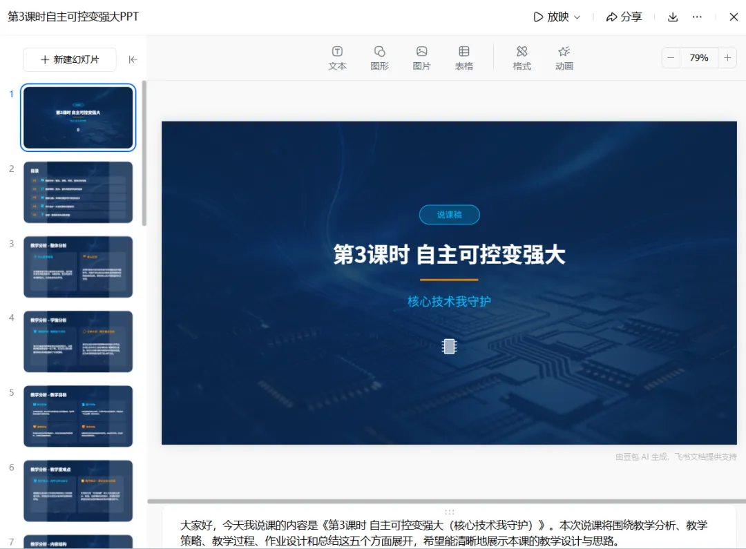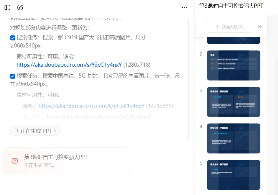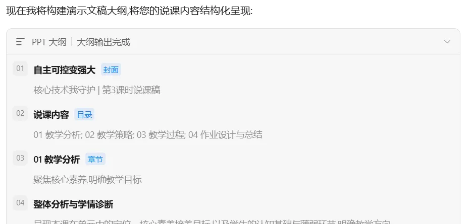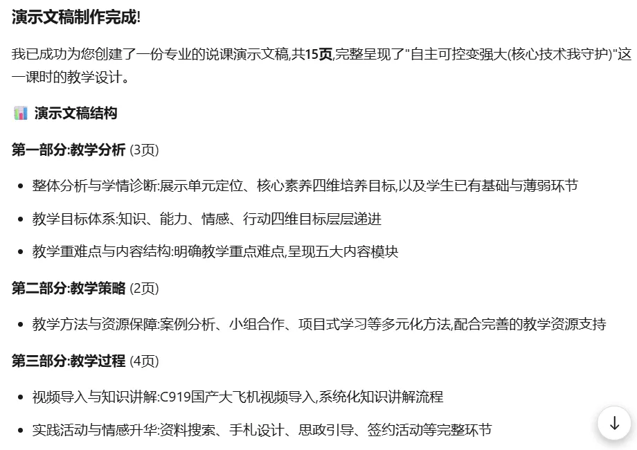 千问生成的PPT也可以在线编辑,也可以通过右上角的【导出】按钮下载到电脑中进行修改。打开豆包网页版,在输入框下方找到【PPT生成】按钮,点击打开PPT生成功能。整体设计好后,搜索相关内容及可用素材,开始生成PPT很快完成制作,在屏幕右侧显示出生成好的PPT,这个也可以在线编辑。同样也可以下载到本地。1.从操作方式上看三款AI都没有什么区别,这次我用的是最简单的方法:准备内容→上传文件→输入指令→提交→(等待)→查看→下载。这些过程可以说完全一样,其中千问需要用户自己选择模板才能进行下一步操作,其它还有AI反馈的信息略有不同。在实际使用中输入指令这一环节中我们可以根据自己的需求说明要求每页只显示大纲,或者在哪一个内容上做出更详尽的显示。2.生成PPT的时间上来看,这次PPT生成时,Kimi使用了27分钟,千问生成速度可以说“立等可取”,除了生成PPT环节中稍有等待,几乎是点完【下一步】按钮,都可以说是立即完成。豆包页面提示使用了3分2秒的时间,从这一点上看千问、豆包生成PPT的时间效率胜一筹。但这一点上,不可以只看时间,可能在不同的内容和生成设置中有所差异,也有一种可能,就是Kimi是大家熟知的PPT生成AI,集中使用的人数较多,说实话,我刚刚接触Kimi的时候,用它做出一个PPT也只不过是几分钟的事情。千问和豆包的生成PPT功能推出时间晚一些是否也有关系。3.文件大小,下图中上面的是豆包生成的PPT文件,占用空间2486KB,第二个是千问生成的PPT文件大小6575KB,下面的是Kimi的7488KB。从文件大小来看豆包生成的文件更省空间。4.最重要的一点是PPT效果,整体来看三个PPT效果基本一致,但从细节来讲,说到教学过程中的提到C919大飞机处,Kimi依然延续文字表述,而豆包则添加了C919飞机的图片,这样会使PPT演示效果表现更佳。在内容表现中,千问多张页面中绘制出思维导图,让PPT演示效果更有特点。以上就是我这次实测三款主流 AI 制作 PPT 的全部过程,这些体验仅代表我个人的使用感受,并非对软件整体性能的评判。