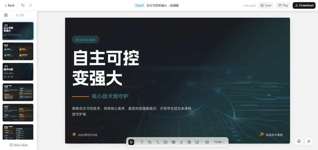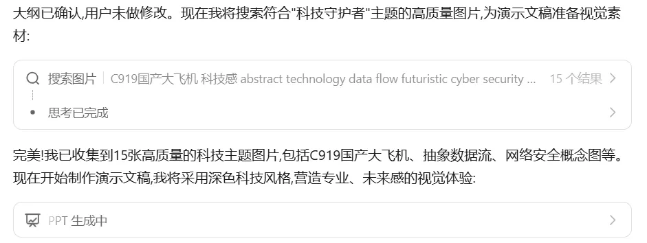搜索要使用的图片——这和真人做PPT的思考和操作过程几乎一样。下面的就是生成的PPT的卡片了,我们可以点击打开PPT,进行查看:整体黑色风格,特别的科技感,PPT可以在线编辑,也可以通过右上角的【Download】按钮下载好本地进行修改。打开千问网页版,找到下方的【PPT】图标,进入PPT模式。等PPT的大纲生成好后点击右上角的【下一步】按钮。下一个界面中需要选择一个模板,我们选择蓝色科技风。最后一步,点击右上角的【生成PPT】按钮。稍等片刻,PPT就生成好了。