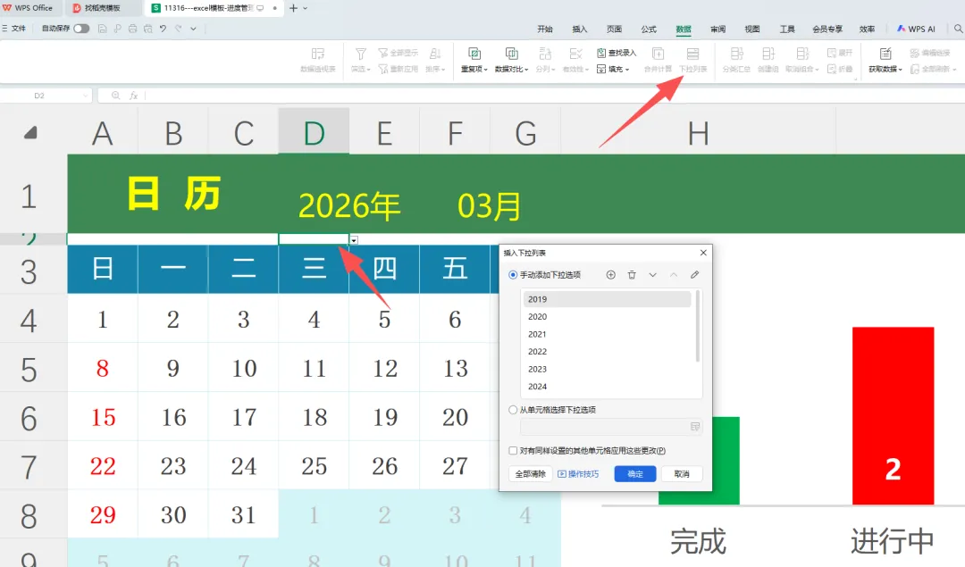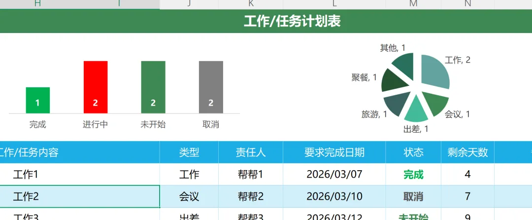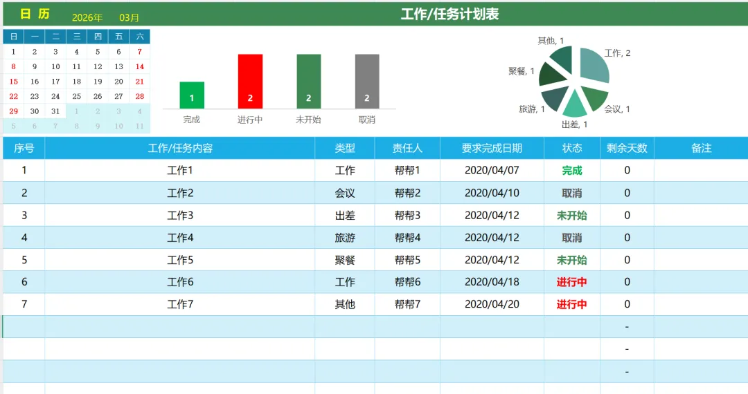 Excel模板:工作计划表,万年历任务跟踪,数据可视化