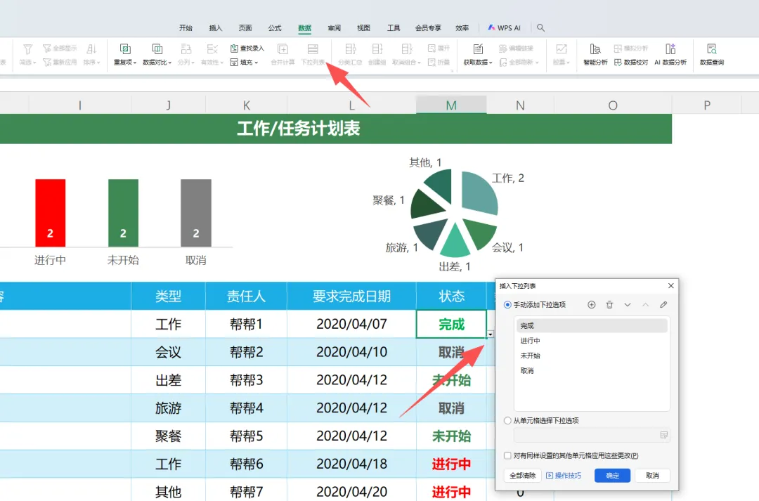 表格中的“类型”和“状态”也通过下拉菜单选择,菜单中的选项同样可以通过下拉列表自定义。其他单元格内容需手动填写。