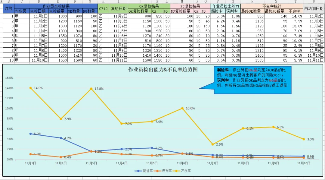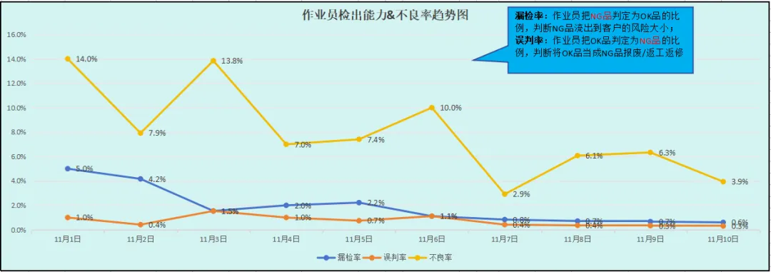 漏检率:作业员把NG品判定为OK品的比例,判断NG品流出到客户的风险大小;