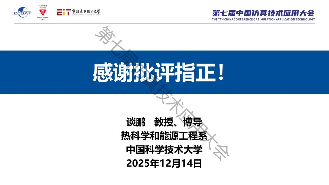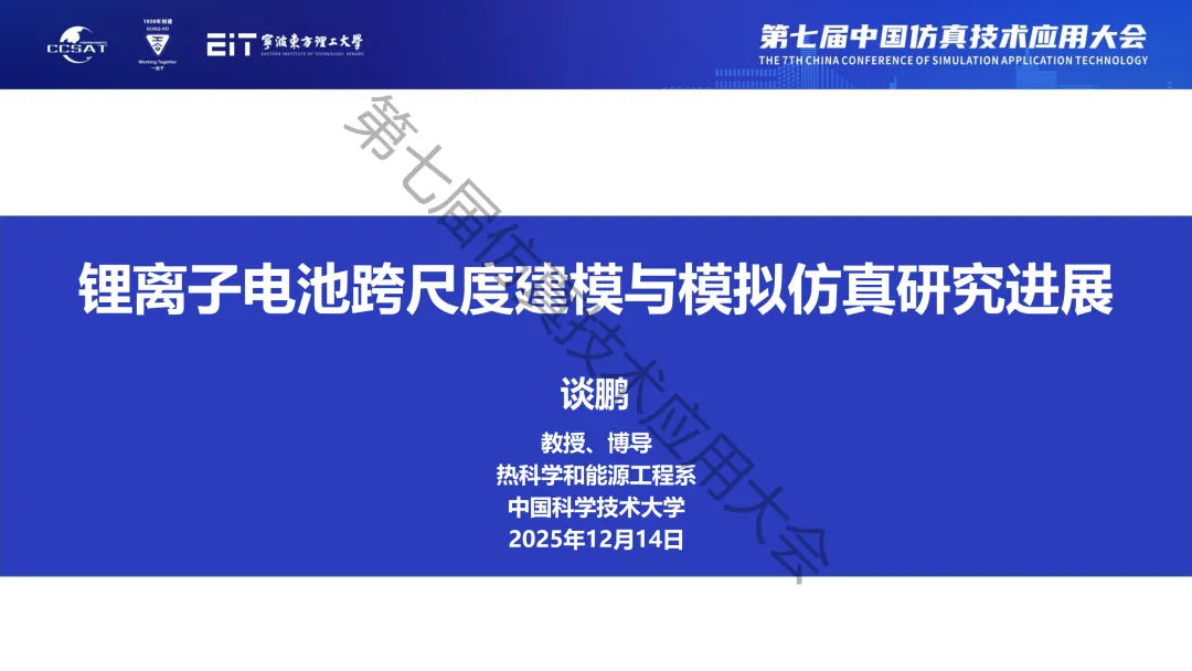 2025年12月13日-14日,第七届中国仿真技术应用大会在浙江省宁波市成功举行,本次大会主题为“AI 赋能与数字孪生:驱动高端装备智能设计革新”,大会分为开幕式、主论坛、8个分论坛、专业展览、参观活动等。100多位专家分享了最新的科研成果和学术观点。“仿真生态圈”持续刊发部分专家的演讲PPT,推动技术交流、产业合作,促进行业生态建设。专家简介:谈鹏,中国科学技术大学热科学和能源工程系执行主任、教授、博导,入选国家人才计划青年项目,中国科学院人才项目终评优秀。主要从事新型电池中伴随能量转化和界面演变的多物种输运问题研究,在输运规律、作用机理以及调控机制方面取得了一系列研究成果。近年来,主持国家重点研发计划“储能与智能电网技术”重点专项青年科学家项目、国家自然科学基金青年及面上项目、安徽省自然科学基金和企业技术开发项目多项,并获首届何享健青年科学家项目资助。已在PNAS、Nature Communications等国际知名学术期刊上发表论文200余篇,总引用9000余次,H指数52;入选全球前2%科学家“年度影响力榜单”(2020-2025)及“职业生涯影响力榜单”(2023-2025);申请发明专利30项,已授权14项;担任Energy Reviews、Future Batteries编委以及Nature Catalysis、Joule、Advanced Materials等70余个期刊审稿人。