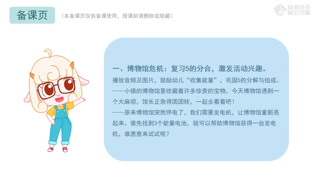 播放音频及图片,鼓励幼儿“收集能量”,巩固5的分解与组成。