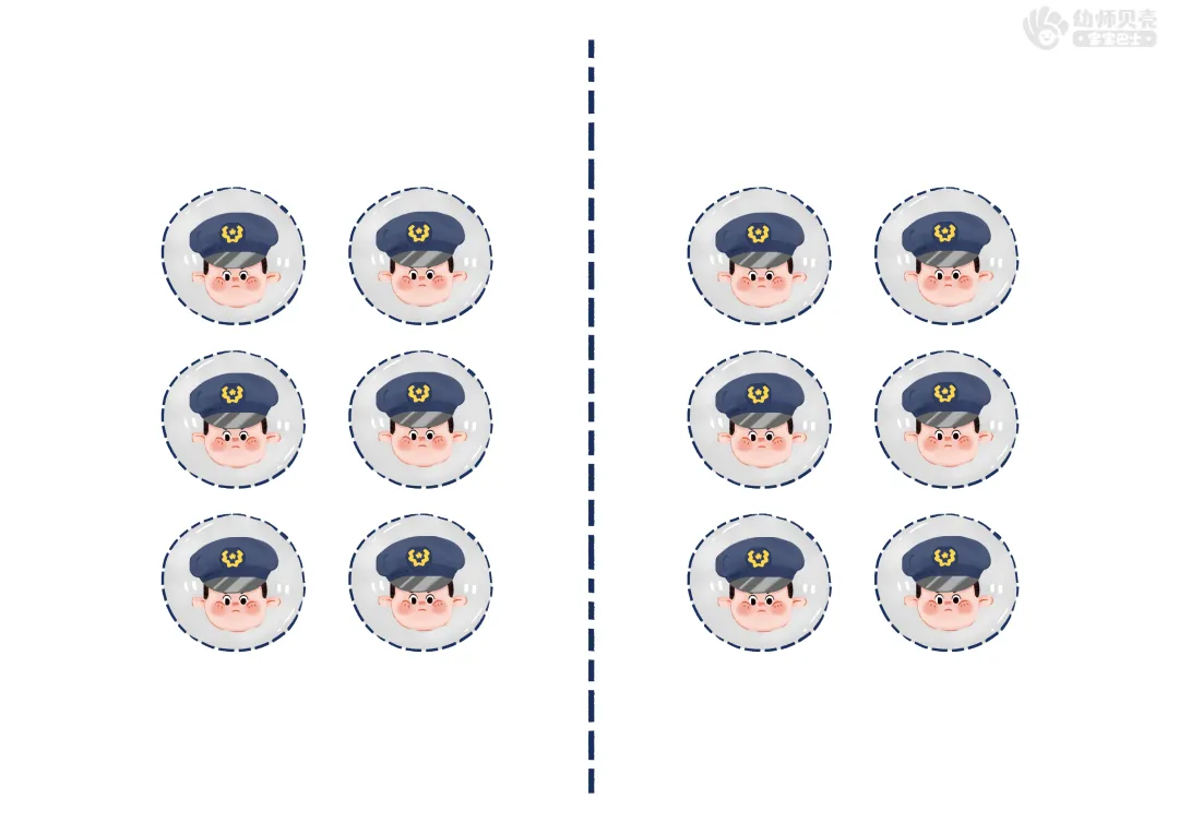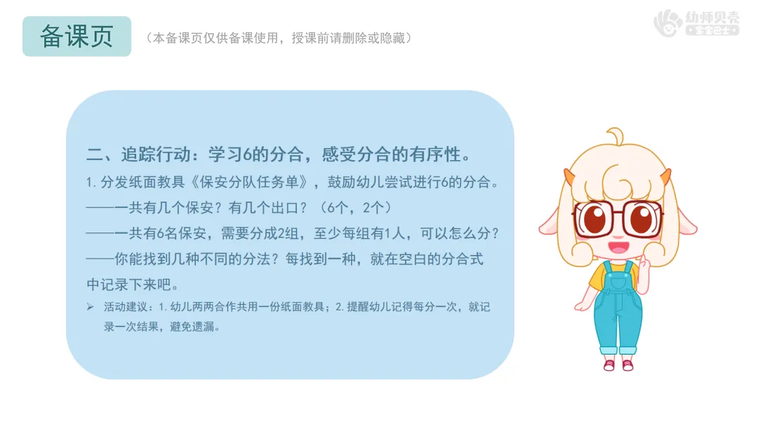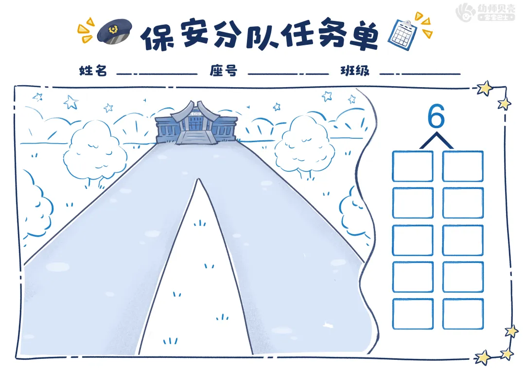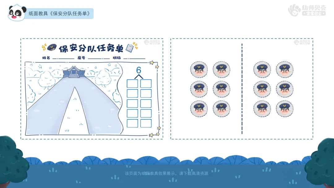 1.分发纸面教具《保安分队任务单》,鼓励幼儿尝试进行6的分合。