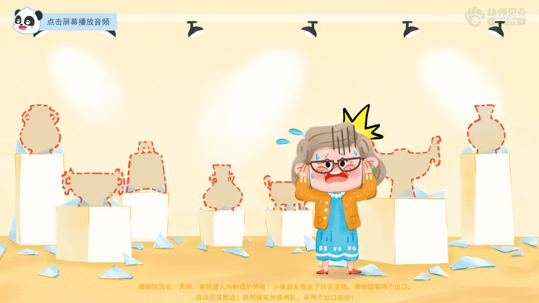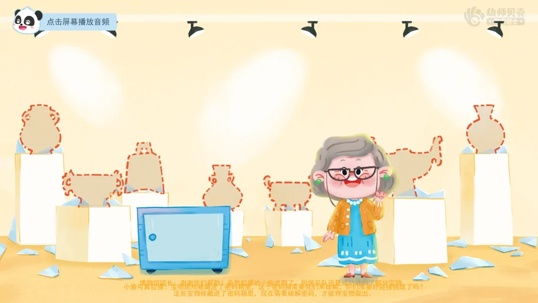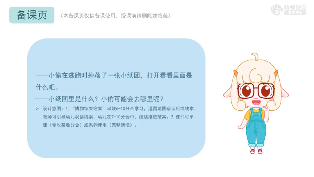 Ø活动建议:1.本活动“博物馆失窃案”串联6-10分合学习,在课件中遗留地图暗示后续线索,教师可引导幼儿观察线索,幼儿在7-10分合中,继续推进破案。2.课件可单课(专攻某数分合)或系列使用(完整情境)。