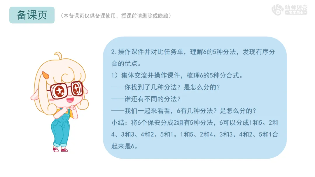 l经验准备:幼儿已掌握5以内数的分合,能正确使用分合符号。(建议优先开展幼师贝壳数学活动《5的合成与分解》作为经验铺垫)。