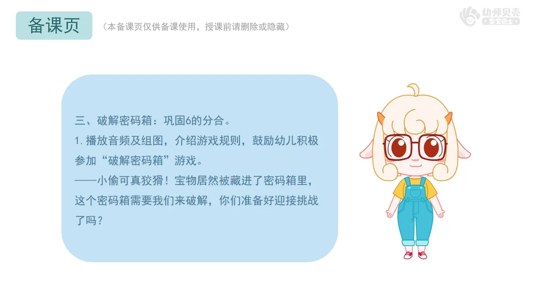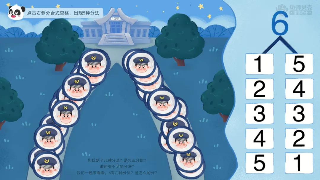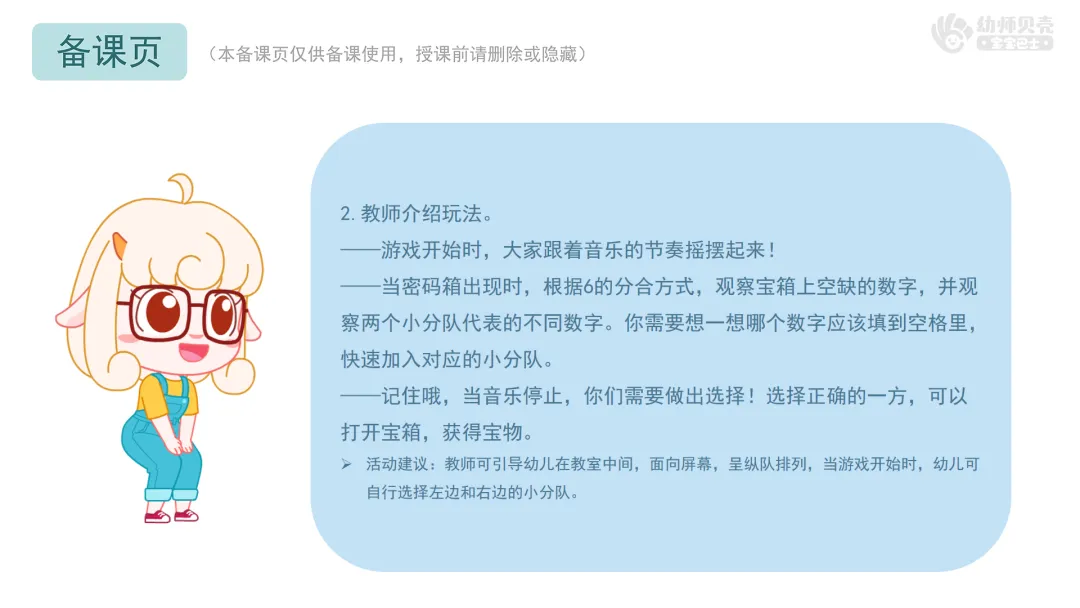 ——游戏开始时,大家跟着音乐的节奏摇摆起来! ——当密码箱出现时,根据6的分合方式,观察宝箱上空缺的数字,并观察两个小分队代表的不同数字。你需要想一想哪个数字应该填到空格里,快速加入对应的小分队。