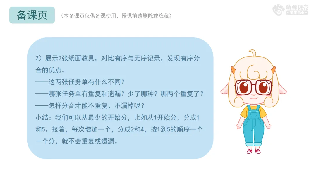 2)展示2张纸面教具,对比有序与无序记录,发现有序分合的优点。