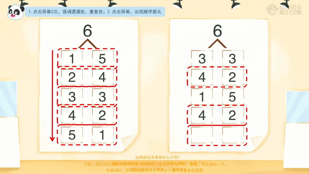 2.操作课件并对比任务单,理解6的5种分法,发现有序分合的优点。