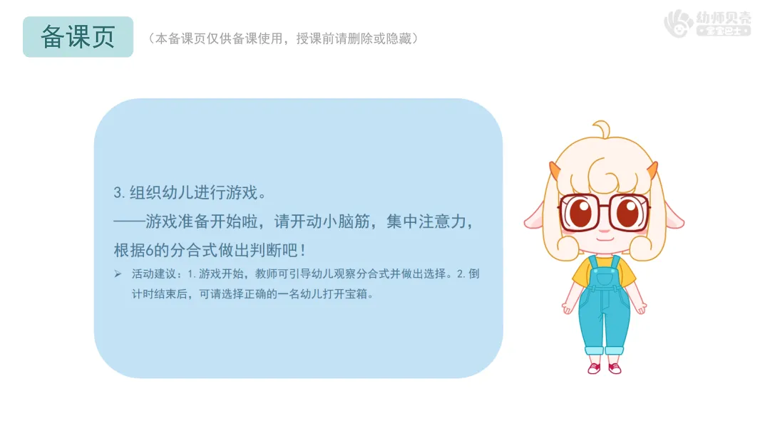 Ø活动建议:1.游戏开始,教师可引导幼儿观察分合式并做出选择。2.倒计时结束后,可请选择正确的一名幼儿打开宝箱。