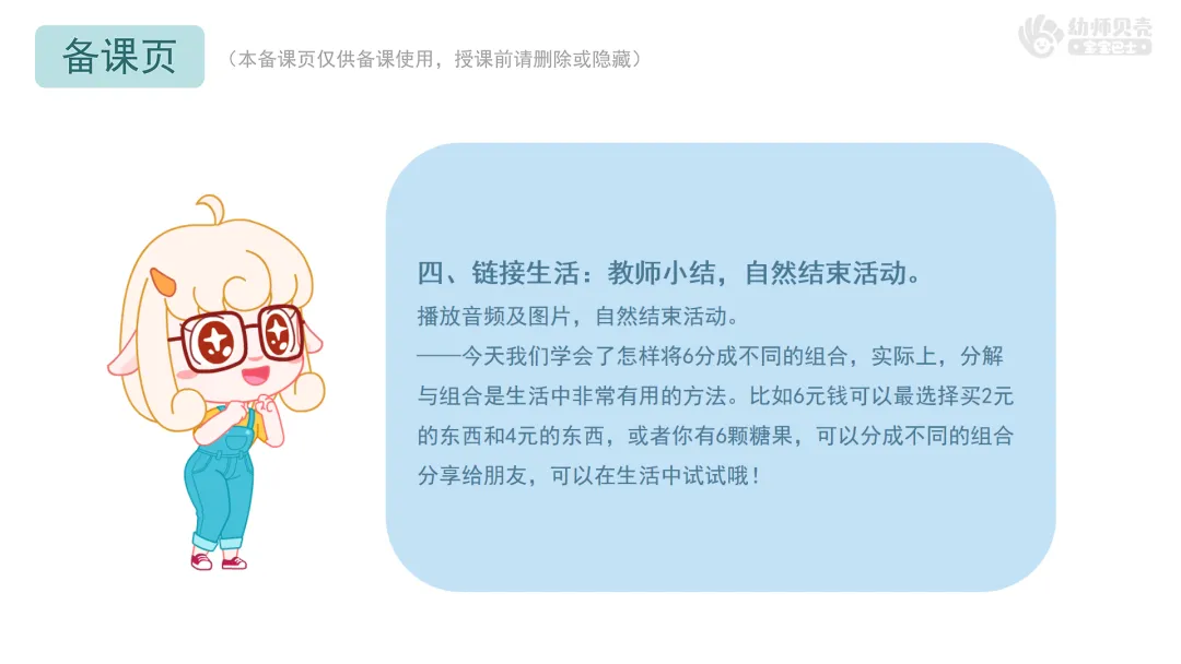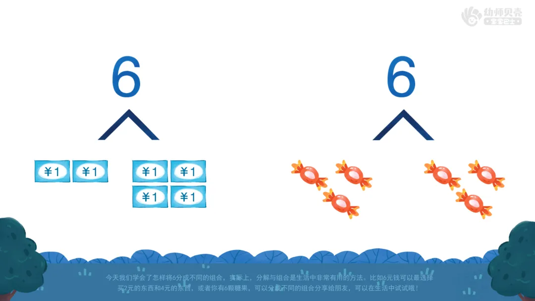 ——今天我们学会了怎样将6分成不同的组合,实际上,分解与组合是生活中非常有用的方法。比如6元钱可以最选择买2元的东西和4元的东西,或者你有6颗糖果,可以分成不同的组合分享给朋友,可以在生活中试试哦!