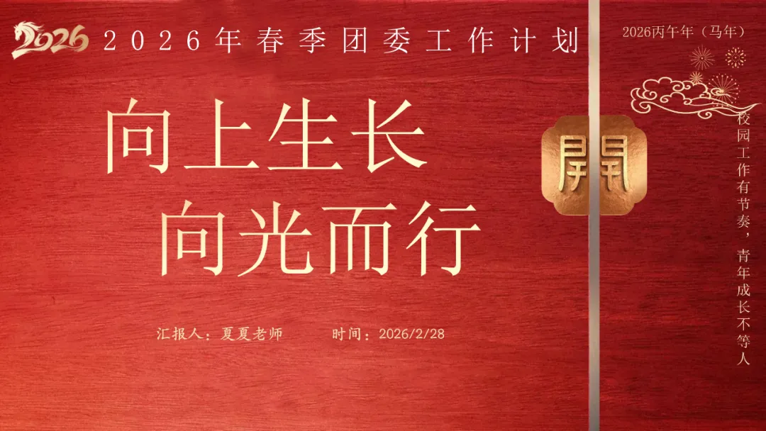 校园工作有节奏,青年成长不等人。对学校团委来说,做好全年工作,不能只停留在“有活动、有安排”,更要落到“有质量、有参与、有成长”上来;不能满足于“完成规定动作”,更要在贴近学生、贴近校园、贴近实际中把工作做细、做实、做出温度。结合学校已有工作基础和本年度重点任务,团委工作将进一步强化思想引领、夯实组织建设、优化成长服务、守好安全底线、加强协同推进、提升传播质效,推动各项工作开好局、起好步、见成效。现结合学校实际,制定本年度团委工作计划如下。