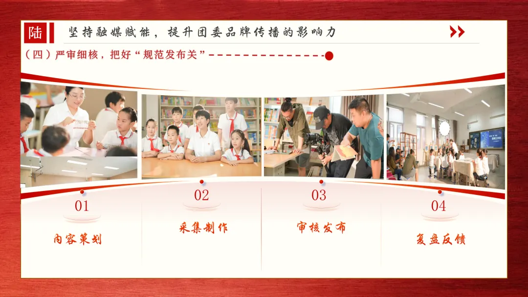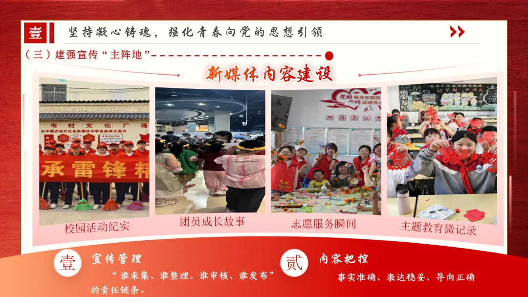 统筹用好校园宣传栏、广播站、黑板报、班级文化角等传统阵地,及时发布主题活动信息、先进典型事迹和校园正向内容;同步规范推进新媒体内容建设,围绕“校园活动纪实、团员成长故事、志愿服务瞬间、主题教育微记录”等方向,形成积极健康、简洁明快、便于传播的内容供给。在宣传内容上,坚持以校内真实场景........