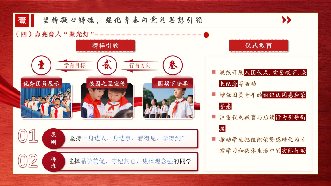 坚持榜样引领与仪式教育相结合,发挥先进典型的示范带动作用。依托优秀团员展示、校园之星宣传、国旗下分享等活动,持续做好身边榜样的发现、展示和学习推广,引导学生学有目标、行有方向。在榜样选树上,坚持“身边人、身边事、看得见、学得到”的原则,把评选展示重点放在日常表现稳定、集体意识较强、志愿服务积极、文明习惯良好、学习态度端正的学生身上......