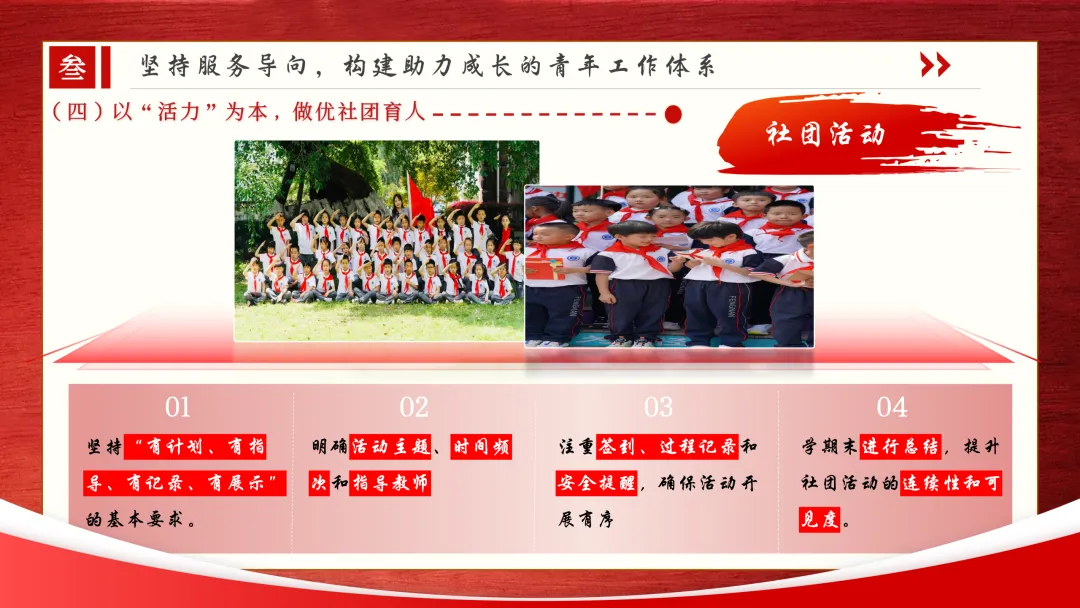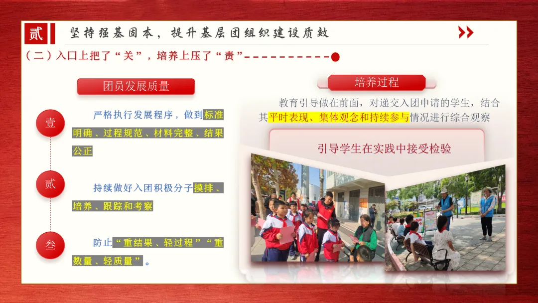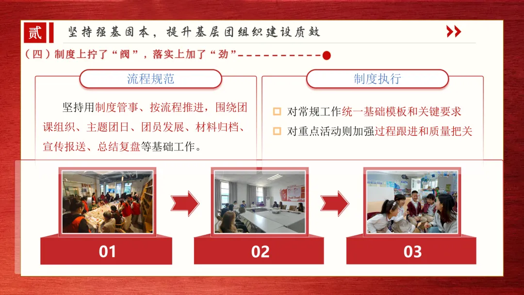 坚持用制度管事、按流程推进,围绕团课组织、主题团日、团员发展、材料归档、宣传报送、总结复盘等基础工作,进一步完善流程规范和任务要求,推动各项工作有章可循、有据可查。结合学校工作节奏,健全例会提醒、节点督办、台账管理、阶段复盘等机制,做到任务清单明确、责任分工到人........
