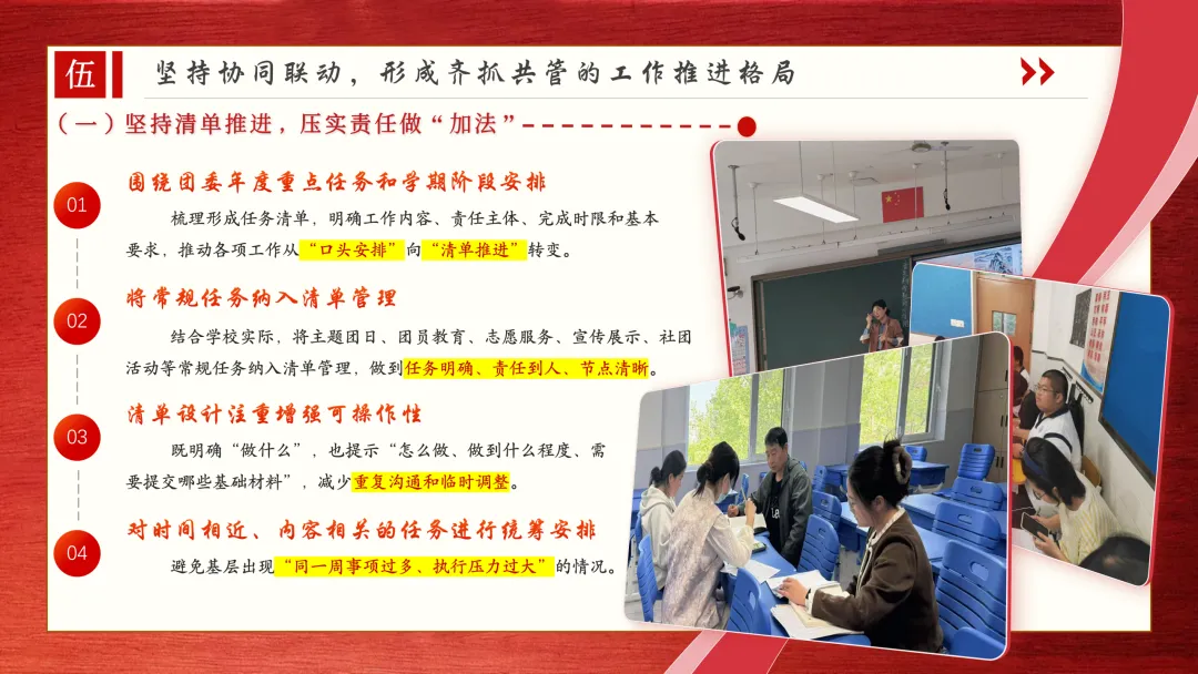 围绕团委年度重点任务和学期阶段安排,梳理形成任务清单,明确工作内容、责任主体、完成时限和基本要求,推动各项工作从“口头安排”向“清单推进”转变。结合学校实际,将主题团日、团员教育、志愿服务、宣传展示、社团活动等常规任务纳入清单管理,做到任务明确、责任到人、节点清晰。在清单设计上,注重增强可操作性,既明确“做什么”,也提示“怎么做、做到什么程度、需要提交哪些基础材料”,减少重复沟通和临时调整。对时间相近、内容相关的任务进行统筹安排,避免基层出现“同一周事项过多、执行压力过大”的情况。