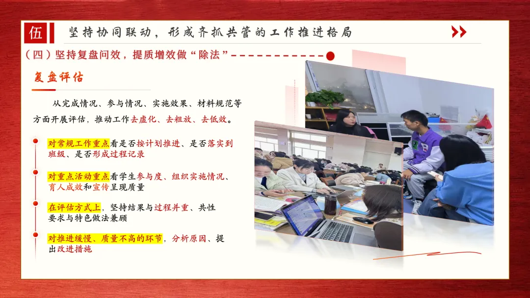 围绕“前期筹备、过程推进、总结反馈”三个关键节点,强化全过程管理,减少推进中的遗漏、脱节和重复消耗。在前期筹备阶段,注重明确主题、细化分工、做好提醒;在过程推进阶段,及时掌握班级落实情况,发现问题、协调优化;在总结反馈阶段,及时收集材料、整理亮点、查找不足,形成阶段性复盘。对重点任务实行节点提示和跟进督办,重点看是否按时启动、是否落实到班级、是否存在执行偏差、是否需要补充支持。对容易出现问题的环节,如通知传达不清、材料标准不统一、活动过程记录不完整等,提前明确要求并做好示例提示,减少返工。