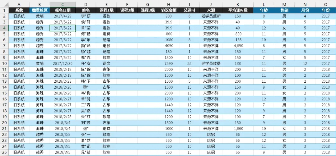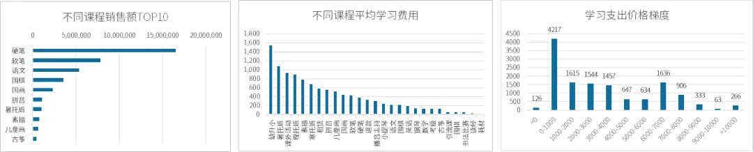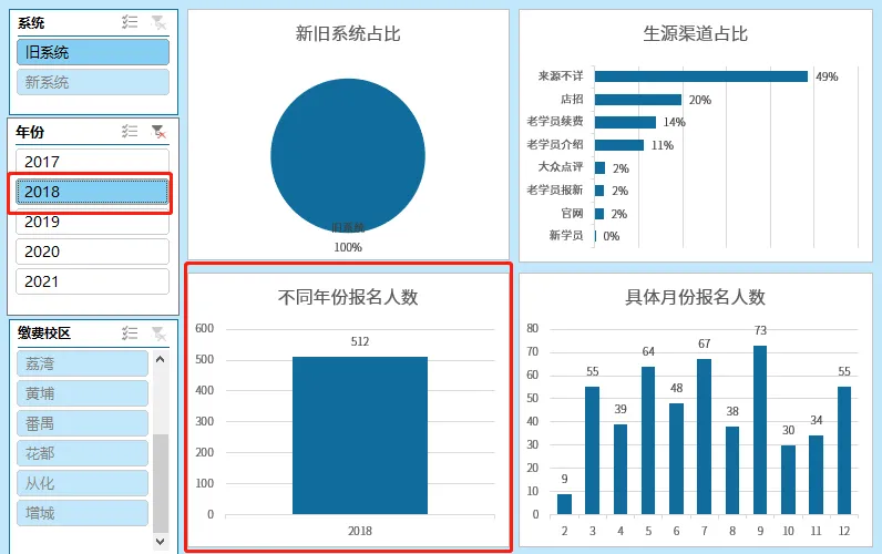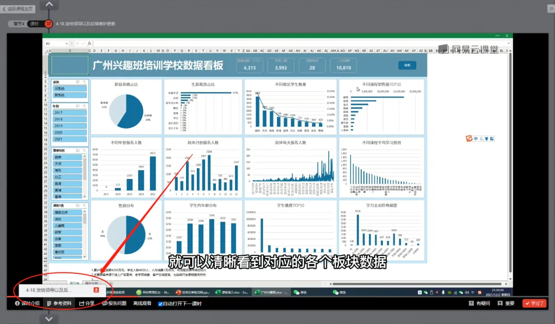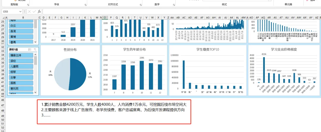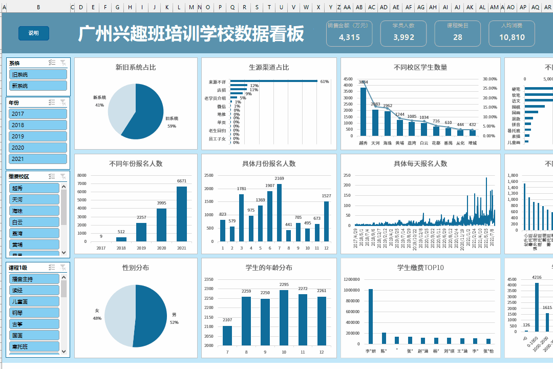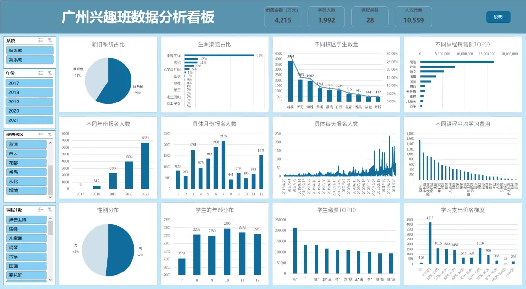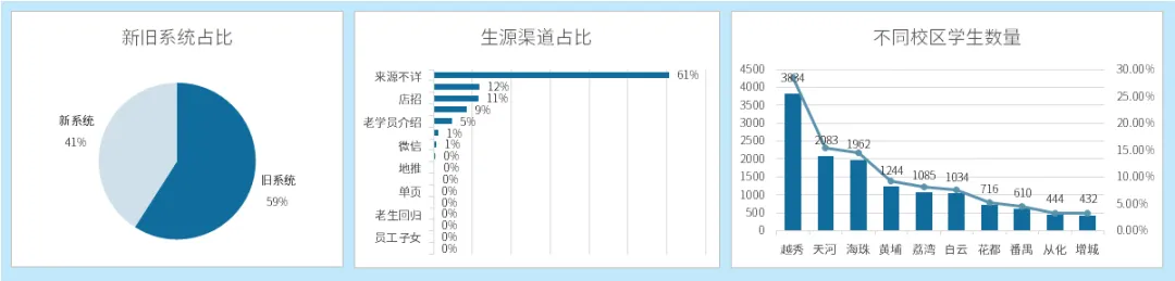 在图表制作分为四大部分,分别是生源渠道,年月日时间维度分析、客户画像、课程价格分析等。