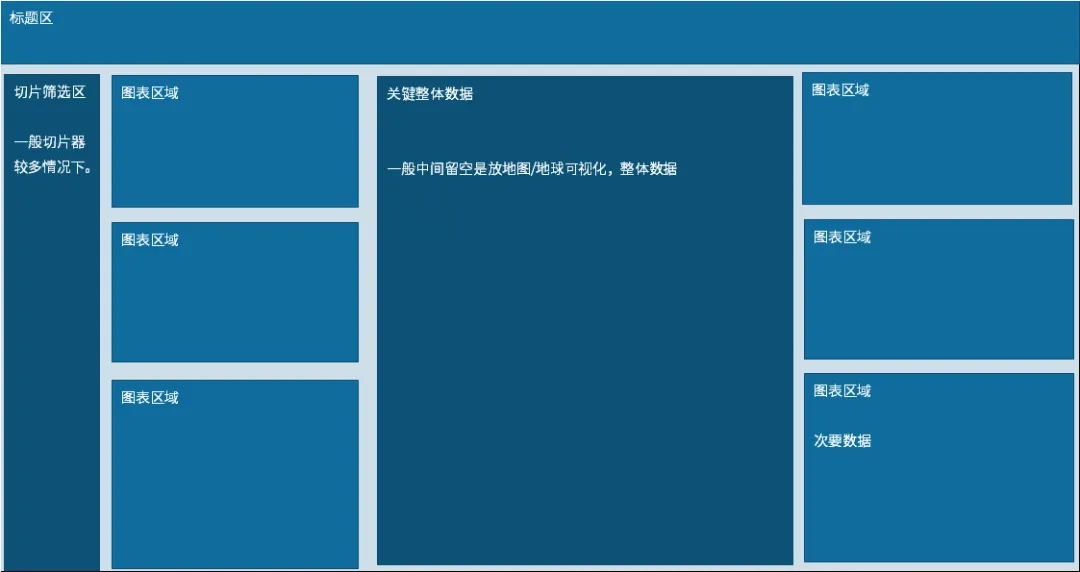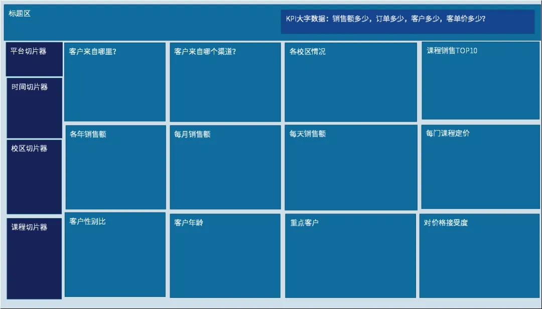 根据项目的实际需求,我们设置处本案例的数据看板排布方式,并把对应的每个区域设置内容填上,可得: