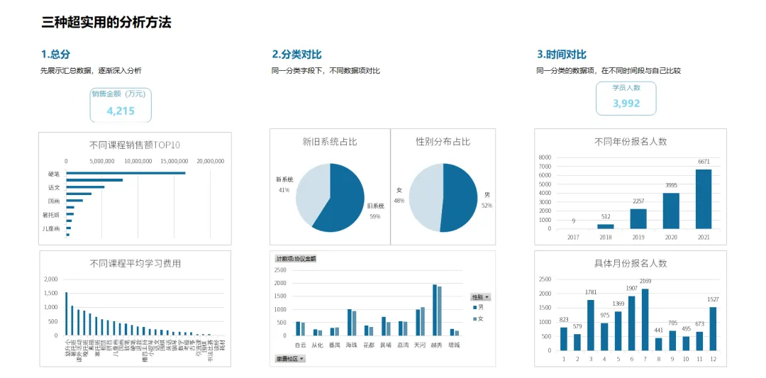 许多小白在刚刚接触数据时,容易没有思路,分享一个3个超实用的数据分析方法。分别是总分,分类对比,时间对比。