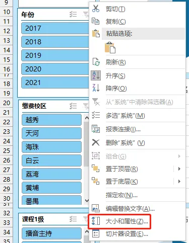 为了切片器可以正常使用,需要先对切片器进行设置,右击【大小和属性】。